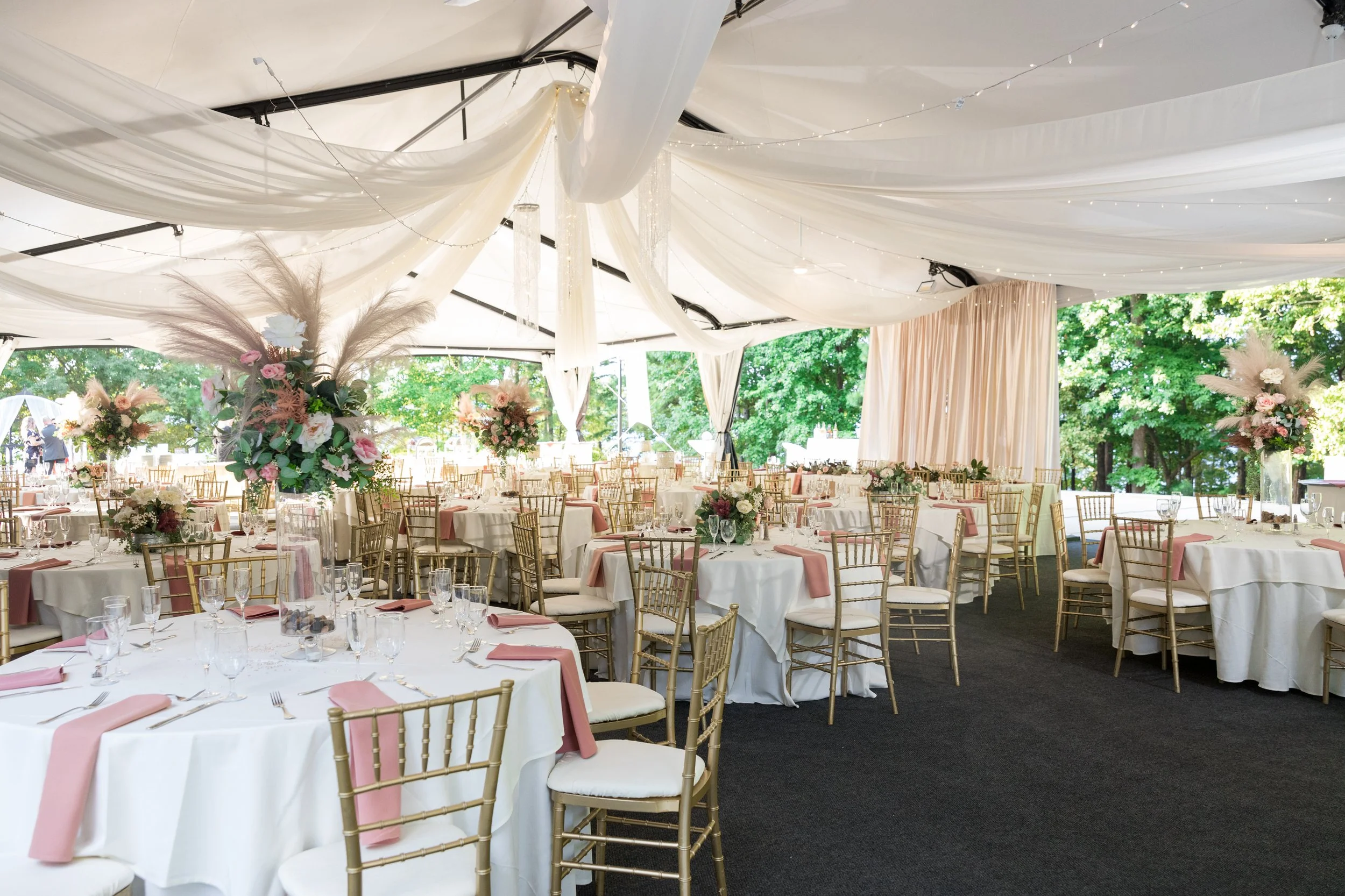 The soaring four-peak ceiling of the pavilion tent billows nearby with tranquil lakeside breezes—a perfect setting for stirring up a little magic in one of our most well-liked and roomy event venues. This lakeside fairy tale venue sets the stage for an extraordinary beginning to your "happily ever after." The perfect location for an outdoor event is Legacy Pointe, which is near to Legacy Lodge.